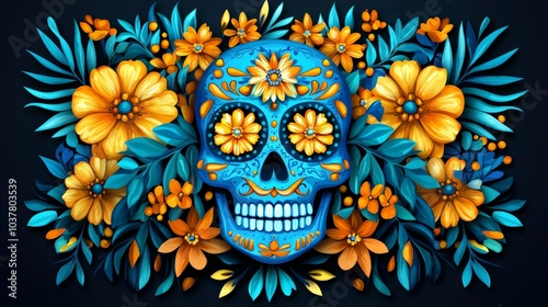 Vibrant floral skull design celebrating life and culture with bright blue and yellow elements for artistic inspiration
