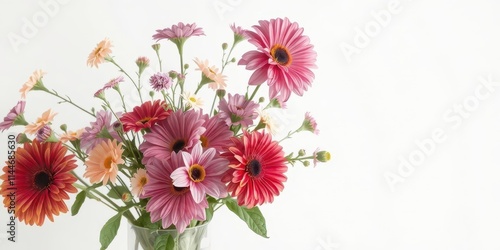 Vibrant flower arrangement in glass vase against pure white backdrop, object, photography, still life