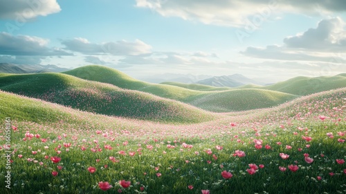 Vibrant Flower Field Under a Clear Sky With Rolling Green Hills During the Day