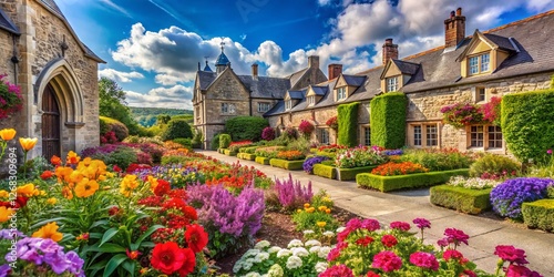 Vibrant Flower Garden Architectural Photography: Colorful Blooms & Stonework