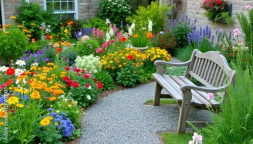 Vibrant Flower Garden with Wooden Bench and Scenic Pathway