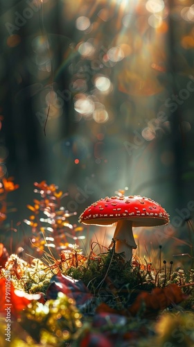 Vibrant fly mushroom perched verdant field sunlit forest glade, inviting wonde striking appearance