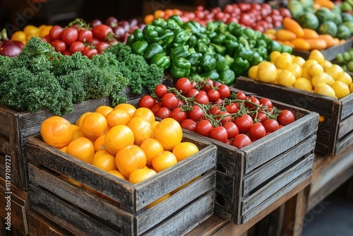 vibrant fresh produce market display with organic fruits, colorful vegetables, and artisanal products arranged in rustic wooden crates