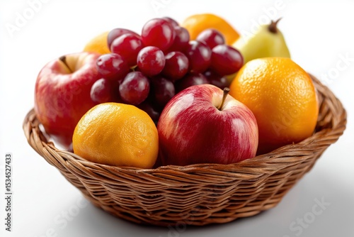 Vibrant fruit basket with apples, grapes, oranges, and pear on white background