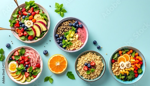 Vibrant Fruit Bowls Healthy Breakfasts Colorful Grains Blue Background