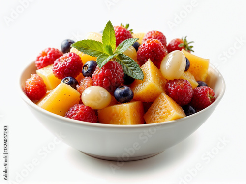 Vibrant fruit salad in a white bowl. Strawberries, blueberries, oranges & pineapple. On transparent background for easy use