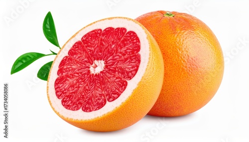 Vibrant grapefruit cut in half with green leaves, showcasing fresh and juicy citrus fruit ideal for health and nutrition themes.