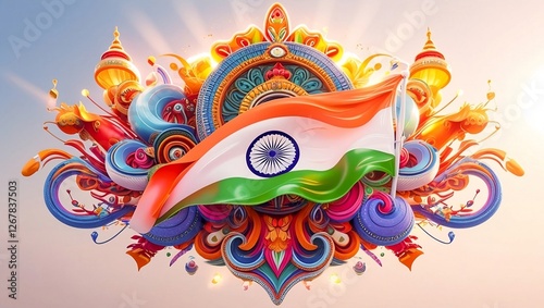 Vibrant Graphic Design Celebrating India's Tiranga Flag with Ashoka Chakra and Radiating Colors