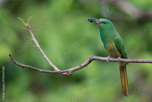 Vibrant green Blue bearded bee eater perched on a dry branch with insect in its beak. The colorful plumage with shades of green, blue and brown stands out against the soft blurred background.