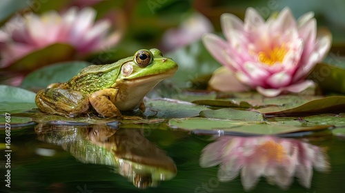Vibrant green frog rests peacefully on lily pads surrounded by delicate pink water lilies in serene pond reflection