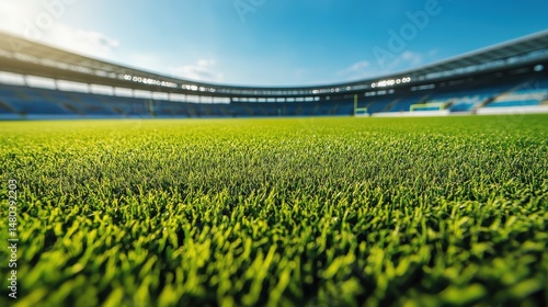 Vibrant green grass on a sunny day inside a professional stadium.
