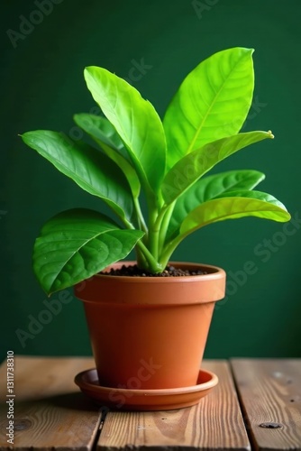 Vibrant green leaves, terracotta pot, wooden table, still life, object