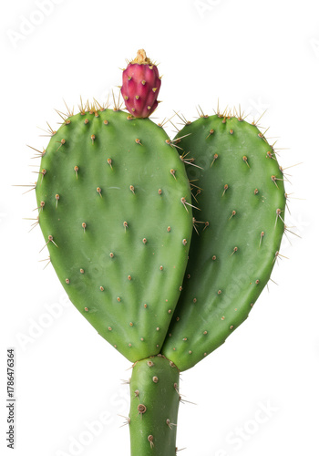 Vibrant green Opuntia cactus with textured pads, fine spines, and two reddish-pink buds, isolated on bright white studio background with copy space, botanical precision concept