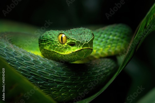 Vibrant green pit viper with intense orange eye amidst lush foliage