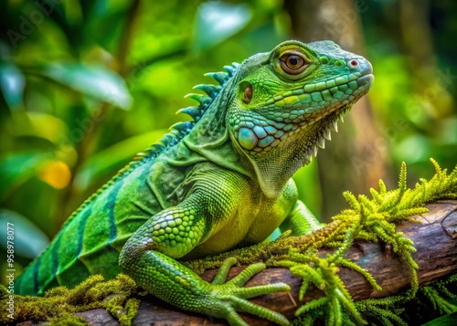 Vibrant green reptile with remarkable adaptability sits on branch, its scaly skin blending seamlessly with