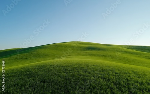 Vibrant green rolling hills with a lush wheat field in the foreground, showcasing the beauty of agricultural landscapes under a clear blue sky