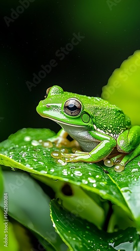 Vibrant green tree frog on a wet leaf