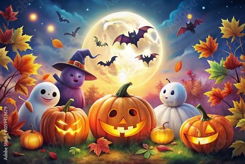 Vibrant Halloween Poster Illustration Featuring Jack-o'-Lanterns, Spooky Creatures, and Festive Decorations for a Joyful Holiday Celebration