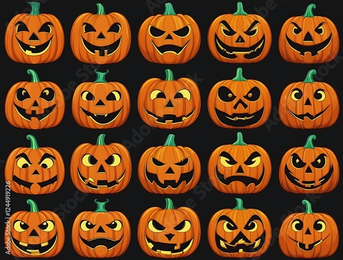 Vibrant Halloween pumpkin pattern showcasing detailed jack-o'-lantern carvings with various facial expressions on a black backdrop, ideal for seasonal projects and decorations.