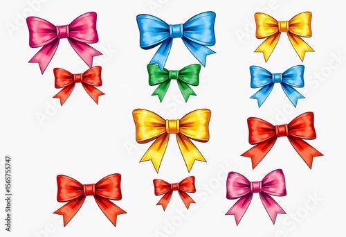Vibrant hand-drawn ribbon bows in various styles and colors, perfect for festive decorations, artwork, sweet