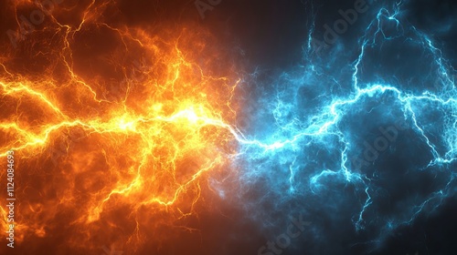 Vibrant hot orange and cold blue electrical lightning energy background with striking high-voltage arcs and dramatic electric storm contrast