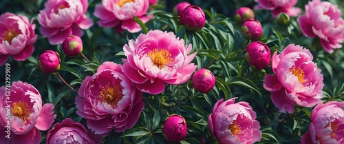 Vibrant Hot Pink Peonies in Bloom Surrounded by Lush Green Foliage Capturing the Beauty of Springtime Flora