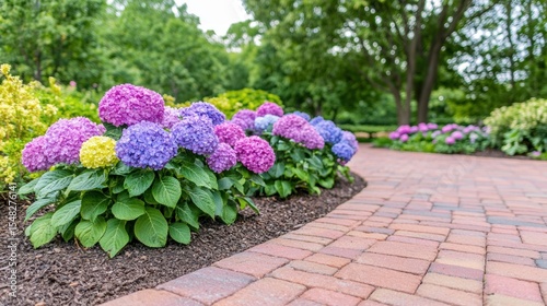 Vibrant hydrangea bloom along serene brick path in lush garden setting