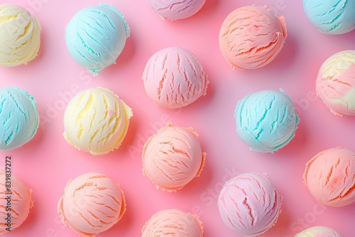 Vibrant ice cream scoop balls on different colored backgrounds, top view of delicious frozen treats