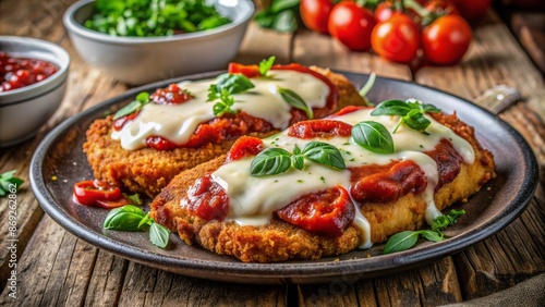 Vibrant, juicy, breaded and fried chicken topped with rich marinara sauce and melted mozzarella cheese on a rustic plate.