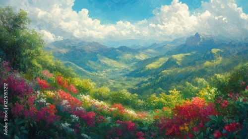 Vibrant Landscape with Colorful Flowers and Dramatic Cloudy Sky