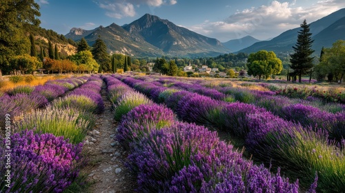 Vibrant lavender fields with mountain backdrop, trees, and village in distance.