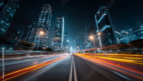 Vibrant light trails illuminate a modern city street at night, capturing the dynamic energy and architectural grandeur of skyscrapers in a bustling metropolis.