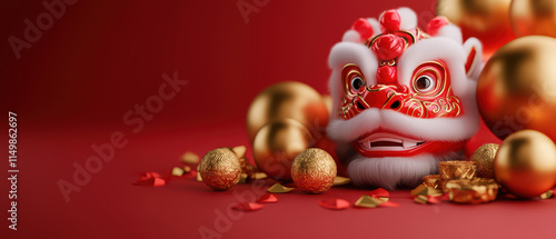 vibrant lion dance mask surrounded by golden ornaments and red decorations, symbolizing celebration and prosperity