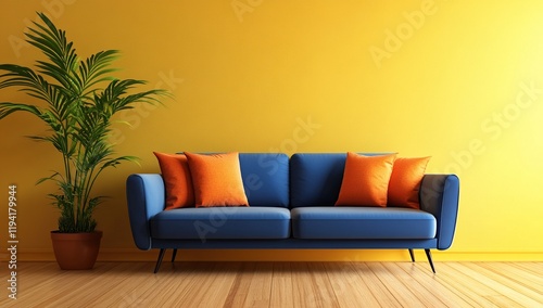 Vibrant Living Room: Blue Sofa with Orange Pillows against Yellow Walls, Stylish Home Decor