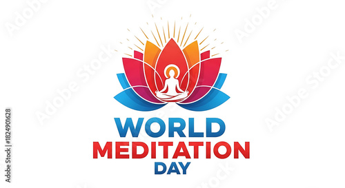 Vibrant lotus flower with meditating figure and world meditation day text