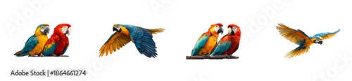 Vibrant macaws showcasing their magnificent plumage and dynamic movements, perfect for exotic wildlife promotions, tropical travel brochures, or nature education content.