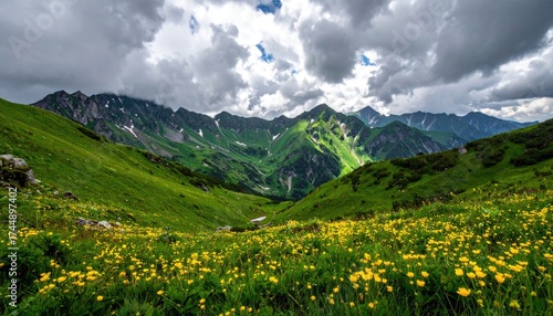 Vibrant Mountain Landscape with Lush Green Meadow Yellow Flowers and Cloudy Sky Under Daylight in Summer Scenery with Rugged Peaks and Natural Beauty