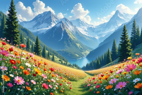 Vibrant Mountain Landscape with Wildflowers and Serene Lake, Perfect for Home Decor or Wall Art