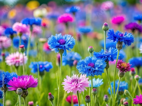 Vibrant Multicolored Cornflowers in Summer Meadow, Blue Banner Background