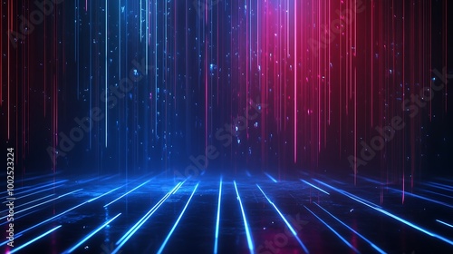 Vibrant neon light beams in blue and red create an abstract futuristic background.