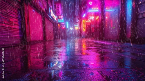 Vibrant neon rainy night scene urban alley photography cityscape low angle mood atmosphere
