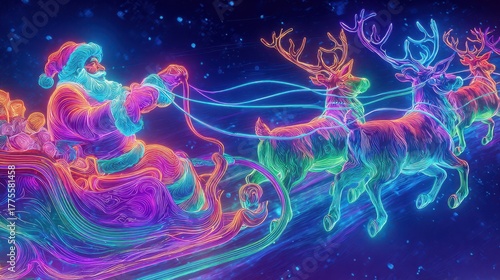 vibrant neon santa claus with reindeer sleigh soaring through a starry night bringing christmas cheer and holiday magic for a festive celebration
