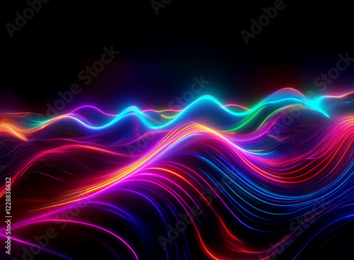Vibrant, neon-colored waves flow across a dark background, creating an abstract landscape of luminous energy. The colors are dynamic and blend seamlessly.