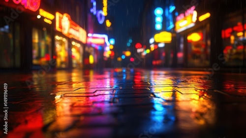 Vibrant Nighttime Scene of Rainy City Street with Neon Lights