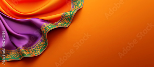 Vibrant orange and purple fabric with golden floral embroidery and green border, creating opulent Indian decorative look. Festive themes, weddings, invitations, ethnic cultural celebrations