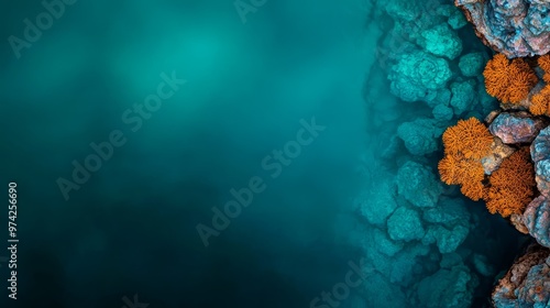 vibrant orange corals dot the seabed beneath crystal-clear, azure waters