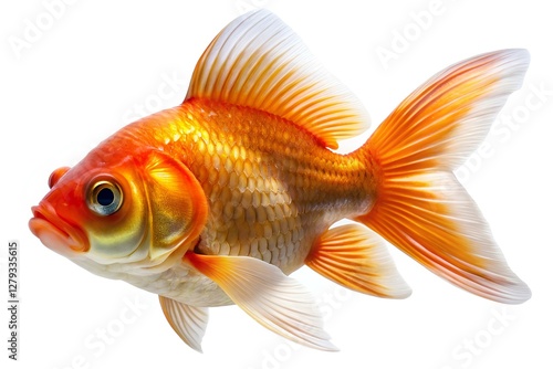 Vibrant orange goldfish isolated on white , Close-up of a bright orange goldfish with delicate fins and detailed scales, isolated on a white background, showcasing its beauty.