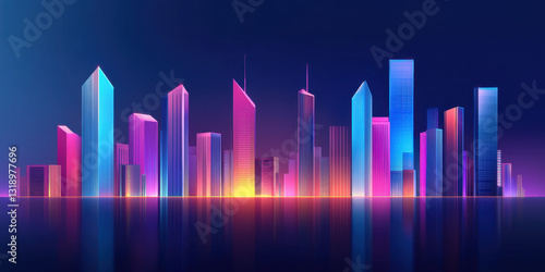 vibrant panorama of futuristic city skyline featuring colorful skyscrapers illuminated in neon hues, reflecting beautifully on water surface