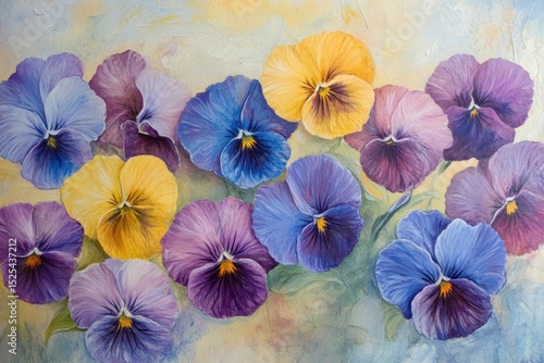 Vibrant pansy flowers in various colors bloom against a soft pastel background in a garden setting, Pansy flowers