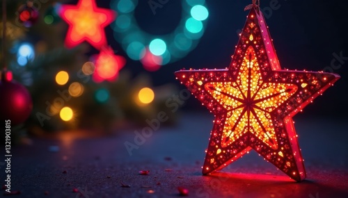 Vibrant papel picado star pi?ata, festive lights, Christmas wreath , tradition, Mexican fiesta, wreath